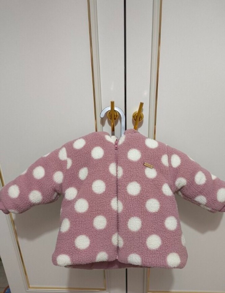 Pembe, beyaz puantiyeli, kürk detaylı yumuşak ve sıcak kumaştan yapılmış, notched lapel yakalı bol kesim kız çocuk mont. 1kere anca gıyıldı 9 12 ay için