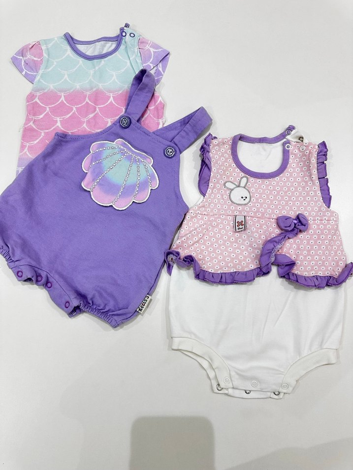 Mor askılı tulum, renkli kolsuz tie-dye body ve tavşan desenli fırfırlı straplez body içeren bebek seti.