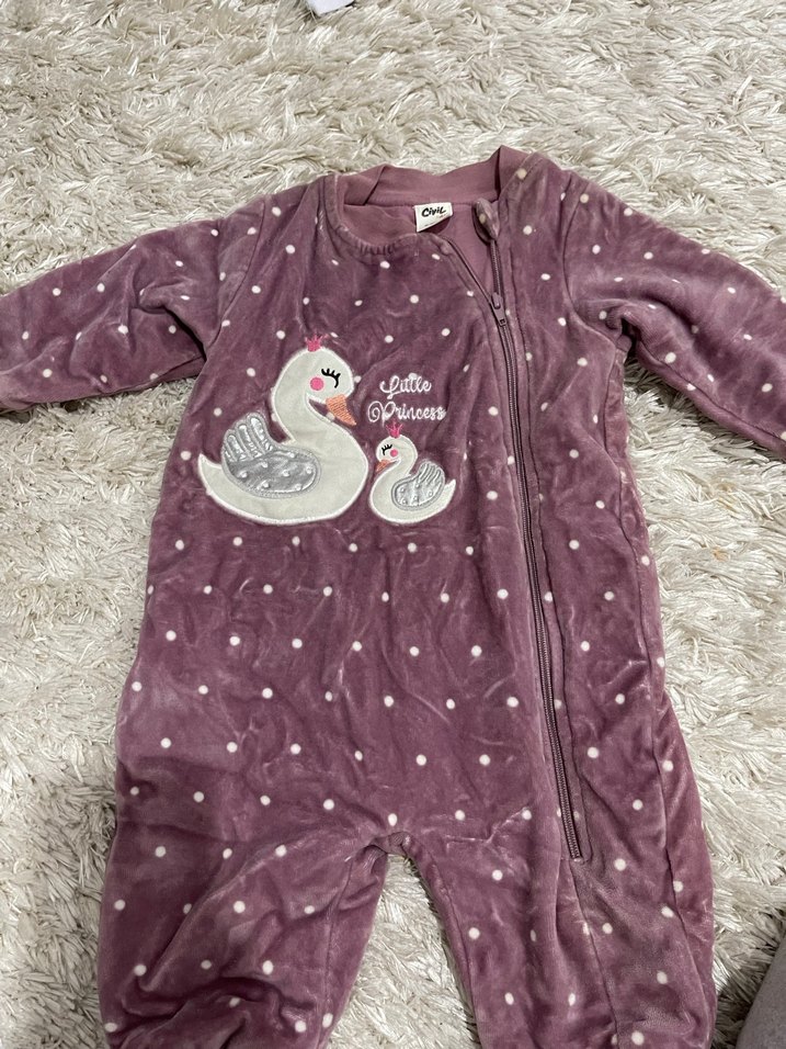 Fermuarlı, mor renkli kız bebek tulumu, kuğu desenli ve V yakalı. Yumuşak ve sıcak kumaştan, puantiyeli desenli. ❄️