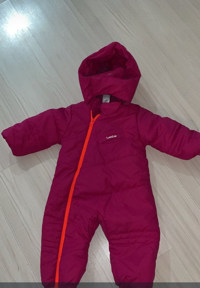 Koyu mor renkte, kapüşonlu ve çapraz fermuarlı kız bebek tulumu. Notlu yaka detayı ve düz renk tasarımıyla sıcak tutar. ❄️