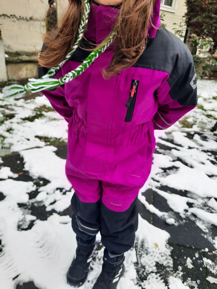 Koyu mor renkte, kayışlı kapamalı ve halter yakalı desen içermeyen kız bebek kayak tulumu. temiz kullanildi 4 5 yas için uyumludur