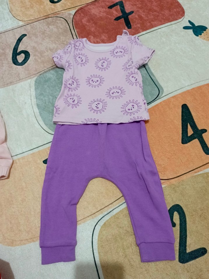 Kız bebek için pastel mor kısa kollu, güneş desenli ve dantel detaylı üst ile düz mor pantolon takımı. hello baby marka 9 ay