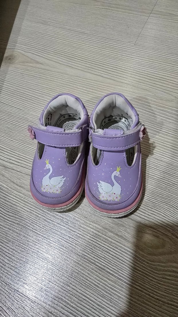 Mor pastel renkte, kuğu desenli ve tokalı kız bebek ilk adım ayakkabısı. Kauçuk malzemeden üretilmiş, rahat ve şık sokak stili için uygun. ortopedik kaymaz taban