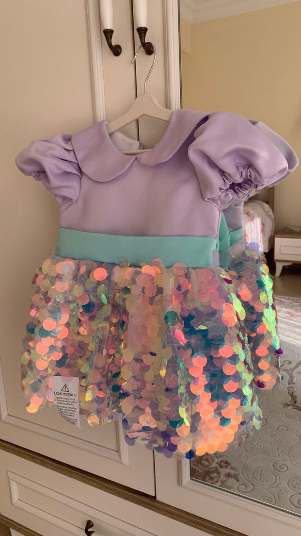 Kız çocuk mor elbise, kısa kabarık kollu büyük parlak payetli fırfırlı elbise 1 yaş için uygundur 1 kere giyildi