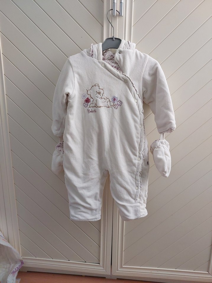 Nakışlı desenli, beyaz kız bebek astronot tulumu. Notlu yaka ve fermuarlı kapanışa sahip, eldivenleri bağlıdır.