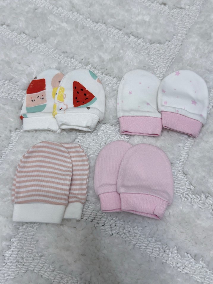 Yumuşak ve sıcak kumaştan örülmüş, nakışlı ve düz desenli pastel renklerde dört çift kız bebek eldiveni seti.