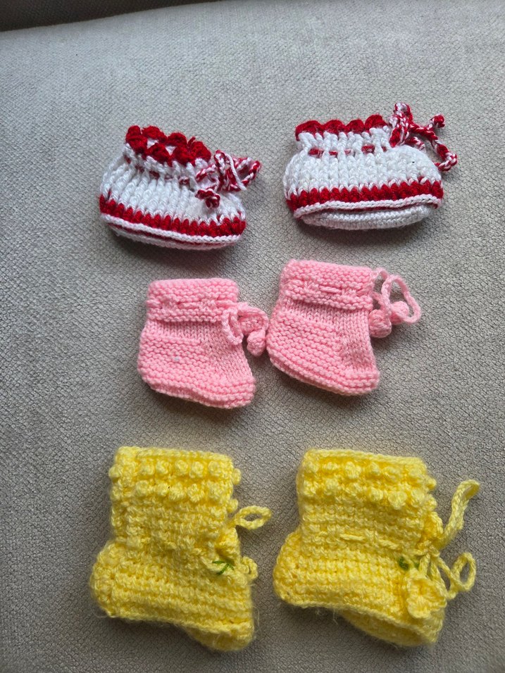 Renkli ve sade tasarımlı, nakış detaylı örgü kız bebek botları seti. Yumuşak ve rahat, küçük ayaklar için uygundur.