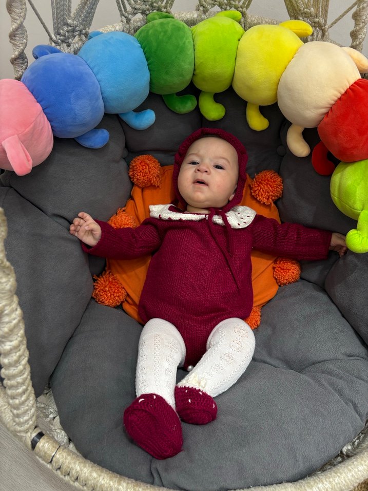 Örgü kız bebek tulumu, halter yakalı ve renkli turuncu tonunda. Desensiz ve yumuşak dokulu, rahat kullanım sağlar. Ürünün şapkası ve patikleri de dahildir fotoğraf çekimi için kullanıldı .ütülemeye bağlı hafif parlama var