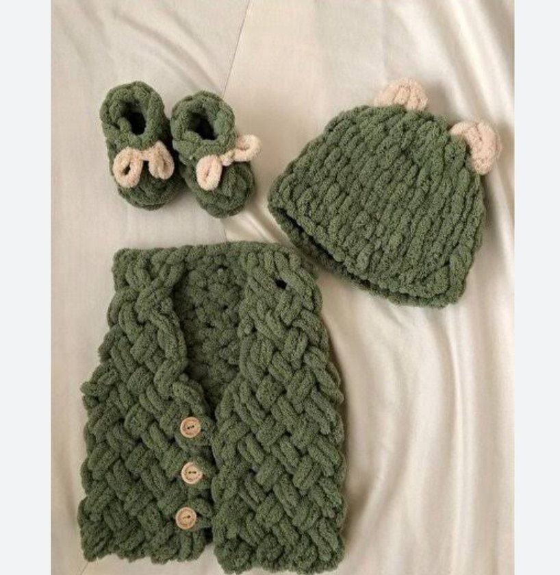 Düğmeli, dokulu örgü hırka, kulaklı şapka ve yumuşak patiklerden oluşan khaki kız bebek seti. Sipariş üzeri çalışıyoruz lütfen almadan önce hangi model ve renk istediğinizi belirtin