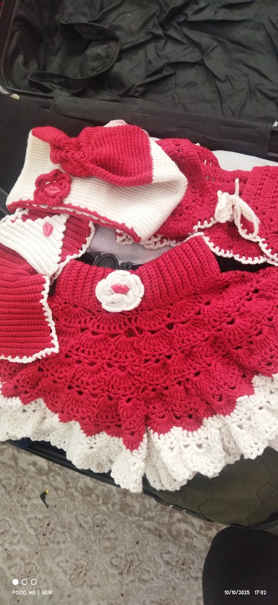 Kız bebek için renkli nakışlı, kırmızı örgü kumaştan uzun kollu takım. Üzerinde beyaz detaylar bulunan şapka ve etek içerir. el emeği göz nurudur. etek,bolero atkı ve şapka içerir .
