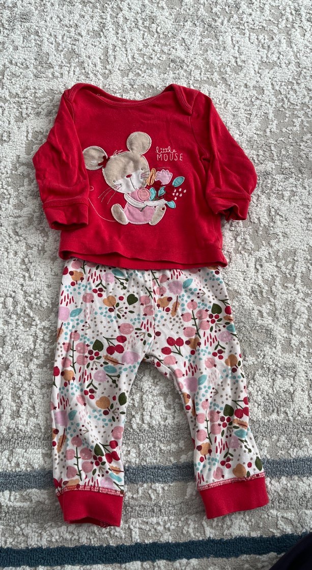 Kırmızı örme uzun kollu üst, sevimli fare baskılı ve renkli desenli pantolonlu kız bebek takımı.