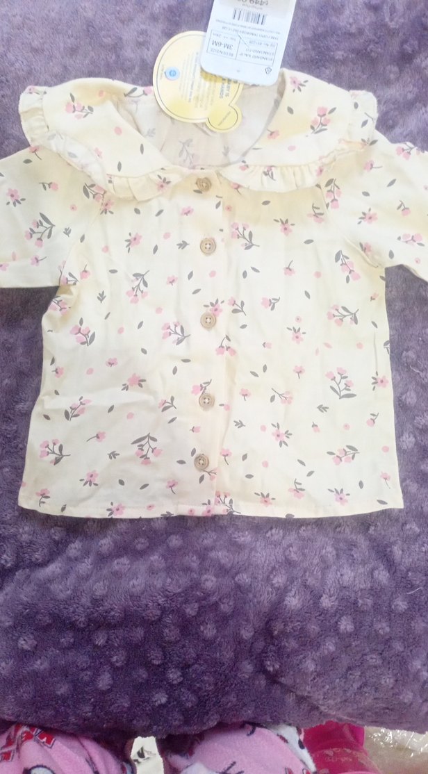 Pamuklu, uzun kollu, düğmeli ve yakalı kız bebek bluzu. Gevşek kesimi ve pastel çiçekli baskısıyla bohem tarzı yansıtır.