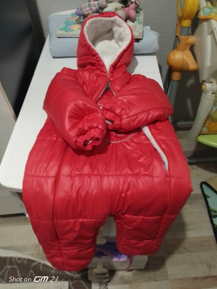 Parlak kırmızı renkli, fermuarlı ve içi yumuşak tüylü kumaşla kaplı kız bebek tulumu. Sokak stili için uygun, soğuk havalar için sıcak tutar ❄️.