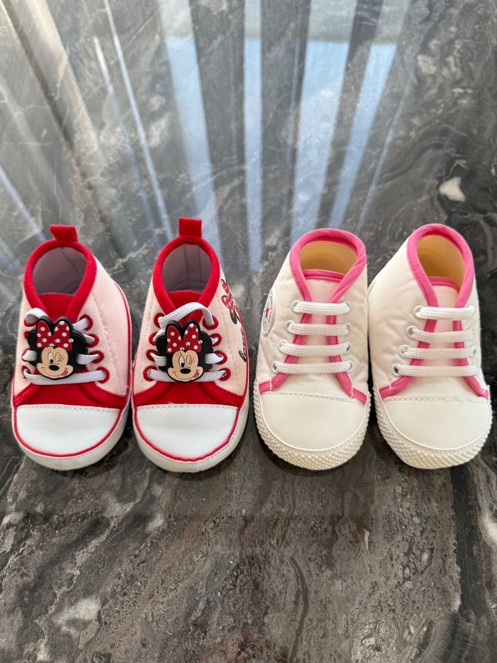 Beyaz ve renkli lastik kız bebek ilk adım ayakkabıları, nakışlı Minnie Mouse figürleri ve cırt cırtlı kapanışlarla, trend sokak tarzına uygun.Hiç Kullanılmadı,bebeğim büyüdüğü için satıyorum,herhangi bir defosu yoktur