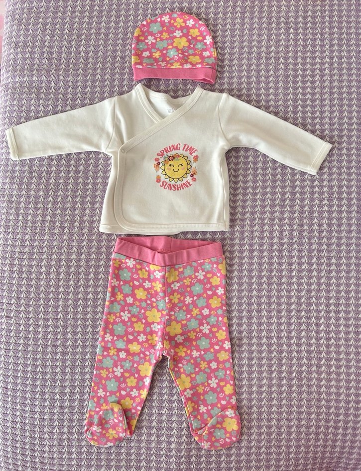 İnterlok V yaka uzun kollu üst Patikli alt ve şapka takım Çiçekli pembe renkli Beden 6 aylık Marka e-bebek markası hello baby Kollarında süt lekesi vardır fotoğrafta görüldüğü gibi.