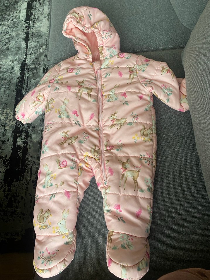 Pastel pembe renkte, desenli ve peluş detaylı kız bebek tulumu. Notlu yakalı ve önü fermuarlı tasarıma sahiptir.