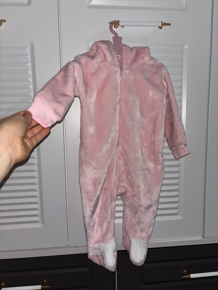 Peluş dokulu, pastel pembe kız bebek tulumu, fermuarlı ve tavşan kulaklı detaylı, sıcak tutar. Yurtdışında alınan ürün❄️