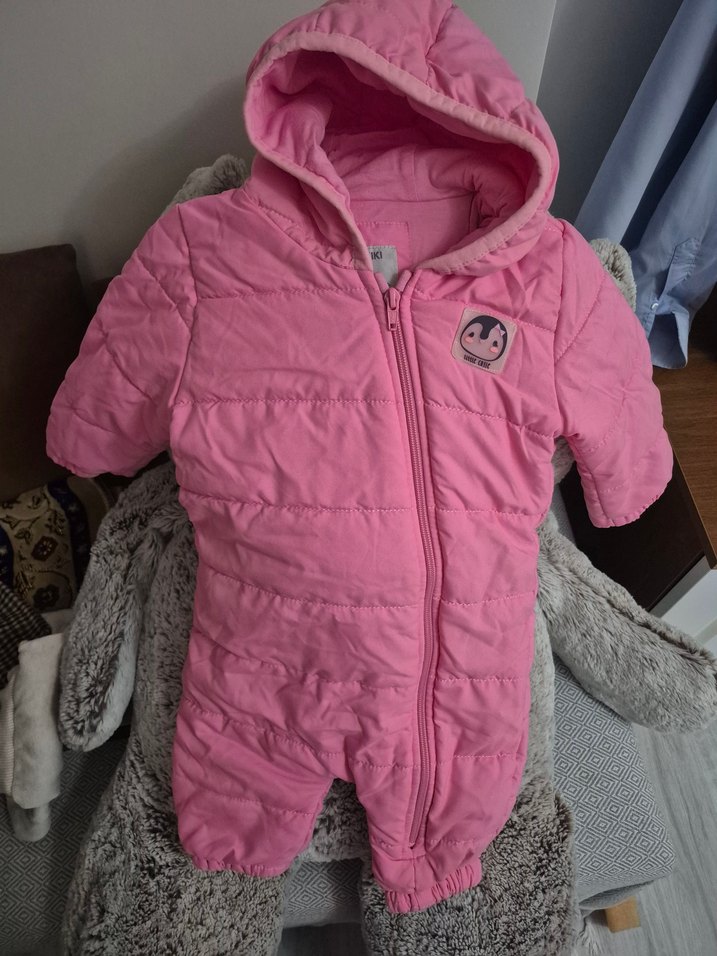 Pastel pembe, kapüşonlu kız bebek tulumu. Yaka tipi notçlu ve önden fermuarlı. Soğuk havalar için yumuşak ve sıcak tutar. ❄️ Yeni gibidir 1-2 kere anca giyildi