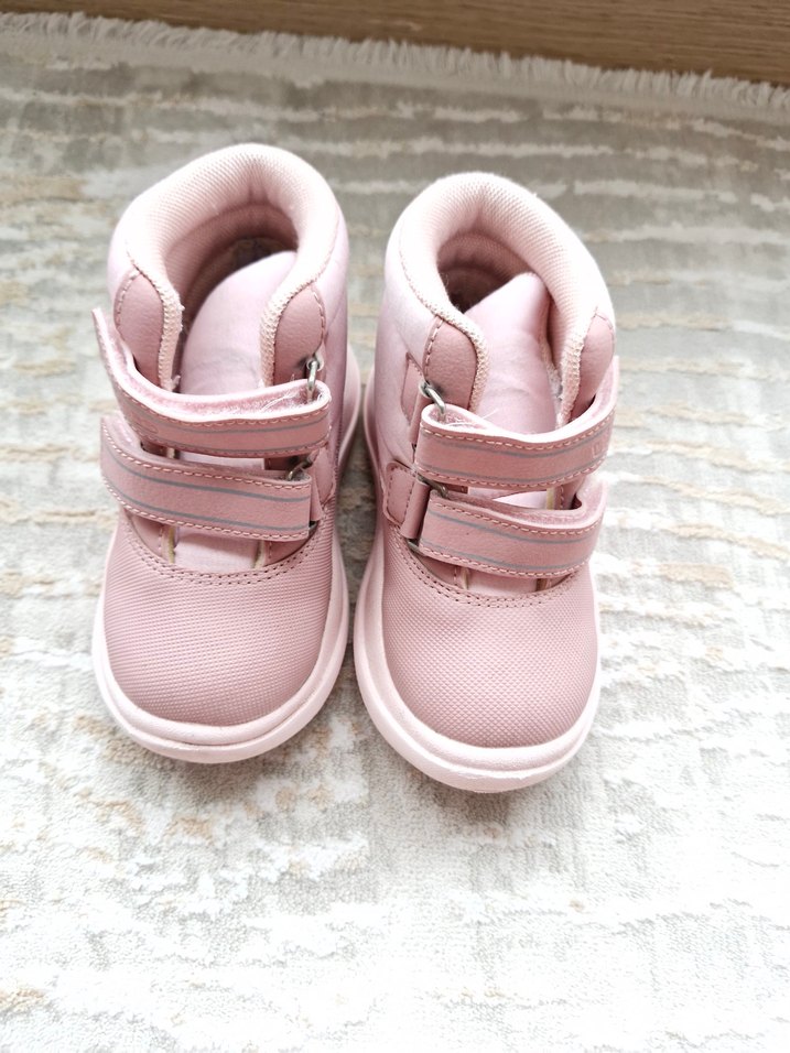 Pembe renkli, velcro bantlı ve kauçuk tabanlı kız bebek ilk adım ayakkabısı, sokak stili için uygundur.