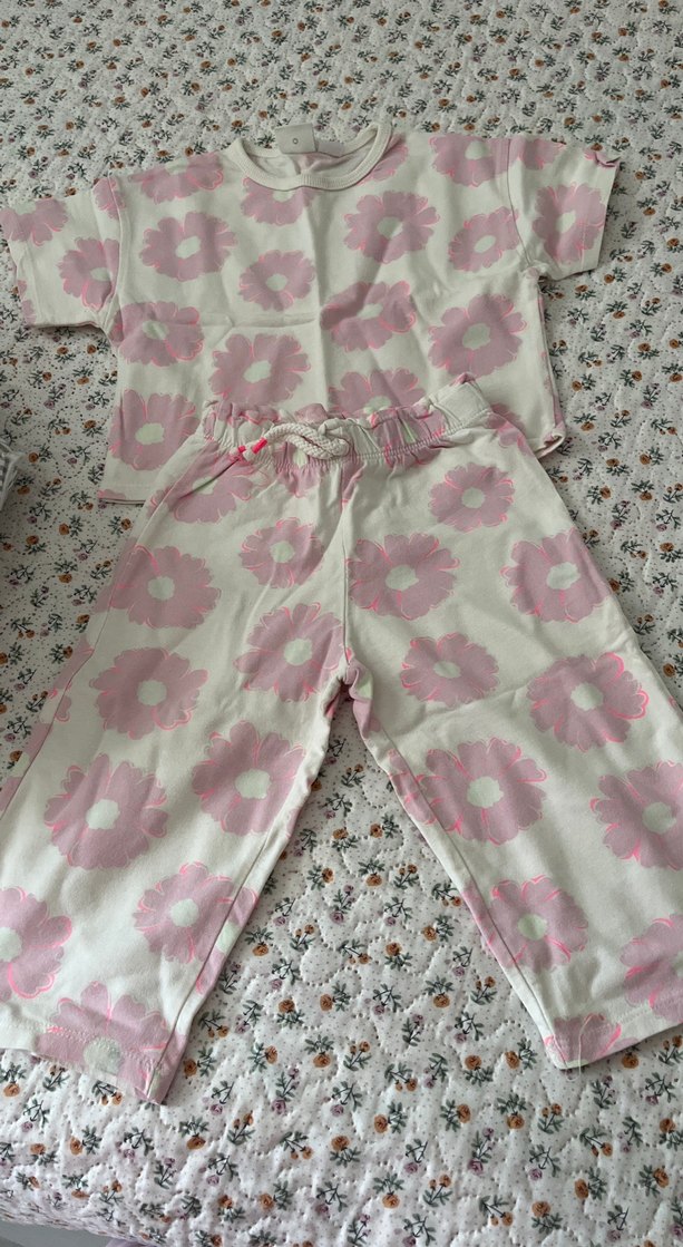 Kısa kollu, pastel pembe çiçek desenli kız bebek takımı, dantel detaylıdır. Yumuşak ve rahat kumaştan yapılmıştır.