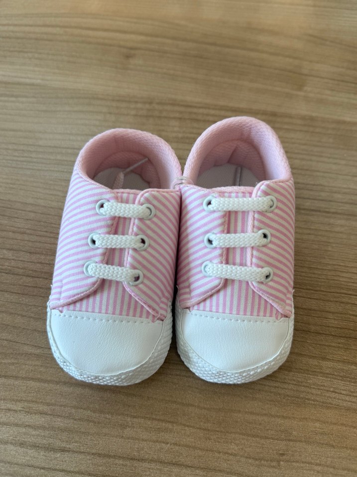Kız bebekler için pembe çizgili ilk adım ayakkabısı, rahatlık ve kolay kullanım için elastik bağcıklar ve yumuşak kauçuk taban içerir.