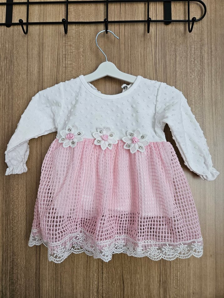 Kız çocuk elbise, uzun kollu ve yuvarlak yakalıdır. Yumuşak örme kumaştan, işlemeli dantel detaylarla tasarlanmıştır. Gevşek kesim ve pastel pembe etek kısmı çiçek süslemelidir.