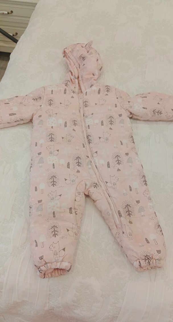 Pastel pembe renkli, kapüşonlu ve kürklü detaylı kız bebek tulumu, baskılı desenli ve fermuarlı kapanışa sahiptir. ❄️ pudra renk