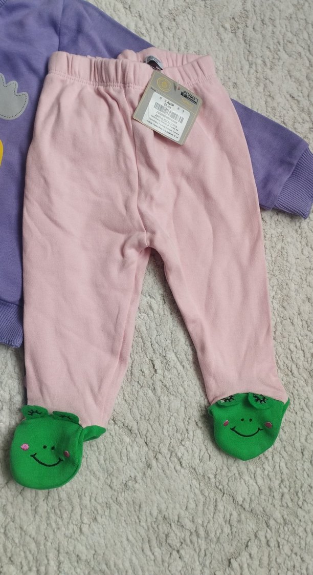 Düğmeli detaylı, pembe renkli, yumuşak dokulu kız bebek pantolonu, ayak kısmında yeşil gülen yüz figürleri bulunur.