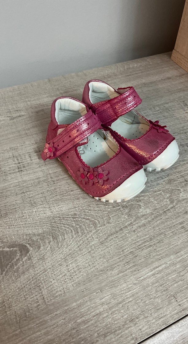 Pembe renkli, kauçuk malzemeden yapılmış, renkli işlemeli ve cırt cırtlı bantlı kız bebek ilk adım ayakkabısı. Rahat ve şık tasarım.