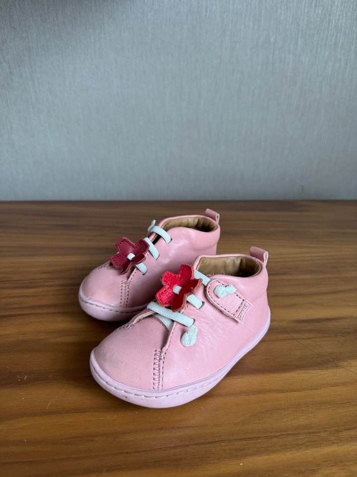 Pembe renkli, cırt cırtlı ve çiçek detaylı kız bebek ilk adım ayakkabısı, rahat ve şık tasarım.
