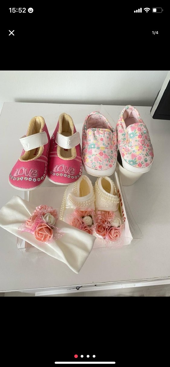 Çiçek desenli, renkli ilk adım kız bebek ayakkabıları, dantel detaylı ve kauçuk tabanlıdır. Bohem tarzı ve uyumlu çiçekli saç bandı ile birlikte gelir. Beyaz ve pembe hiç giyilmedi çiçekli olan 2 kere giyilmiştir ama ne yırtık ne deforme hiç bişey yok 19 numara 18-19-20 numara hepsi fiyatı