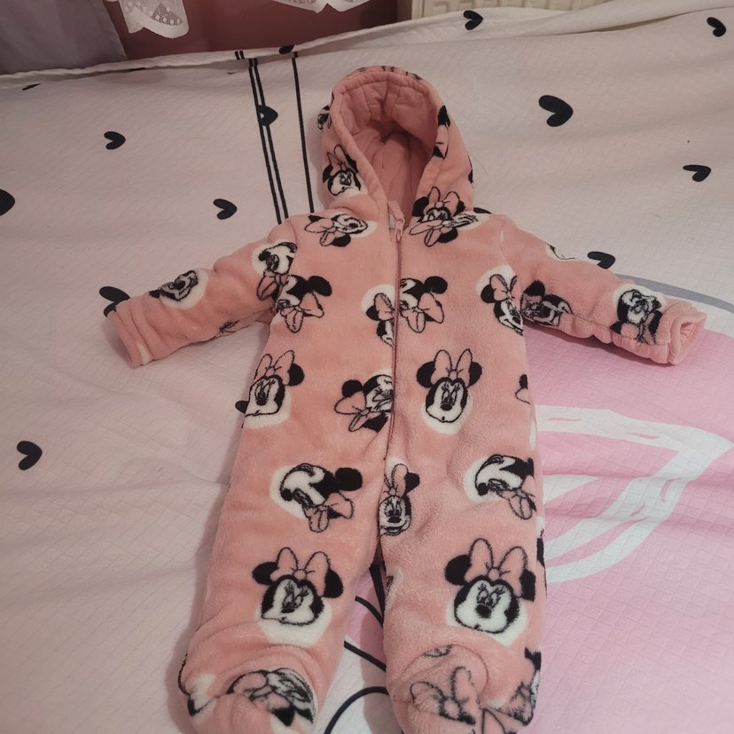 Pembe renkli kapüşonlu kız bebek kar tulumu, baskılı desenli ve kürk detaylıdır. Yumuşak dokulu ve pastel tonlardadır. ❄️