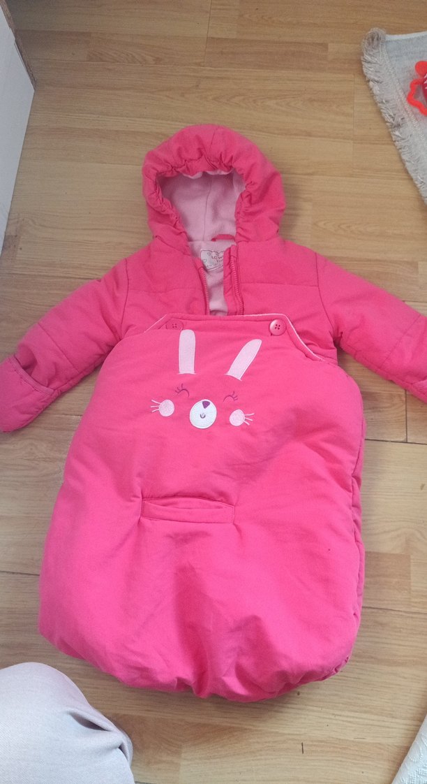 Pembe renkli, kapüşonlu ve fermuarlı kız bebek kar tulumu, renkli baskılı ve bisiklet yaka detaylıdır. Yumuşak kumaş ile sıcak tutar.