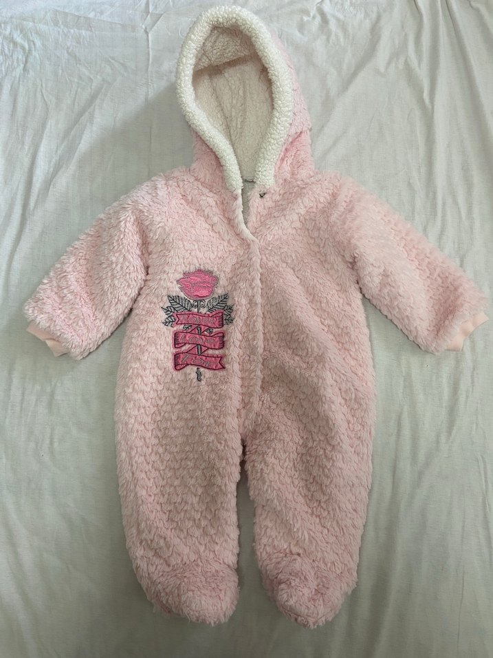 Pastel pembe kapüşonlu, yumuşak kürk astarlı kız bebek tulumu. Nakış detaylı, soğuk havalar için sıcak tutar. Defosuz.