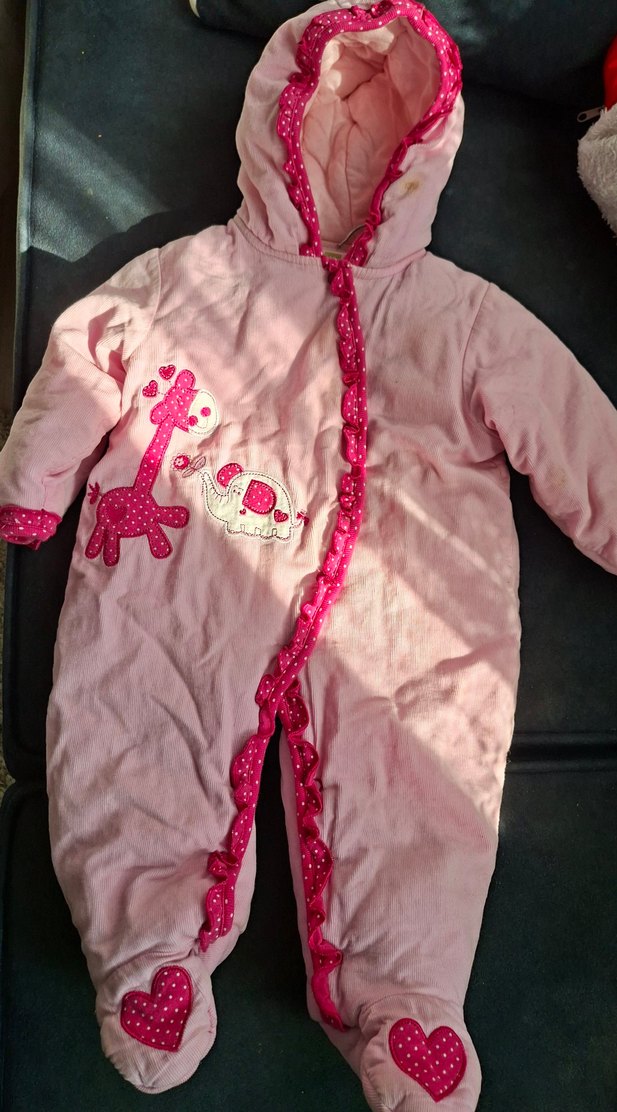Pembe kapüşonlu kız bebek tulumu, renkli hayvan desenleri ve kolay giyim için fermuarlı öne sahiptir. Yaka kısmı notched lapel tarzındadır.