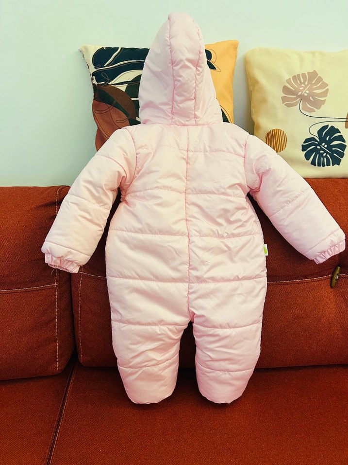 Pastel pembe renkte, kapüşonlu ve fermuarlı kız bebek tulumu. Düz desensiz, sıcak tutan tasarım. ❄️