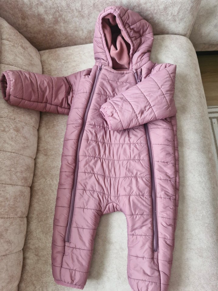Pastel pembe kız bebek tulumu, kesik yaka ve çift fermuarlı. Yumuşak ve dolgulu, sıcak tutar. ❄️