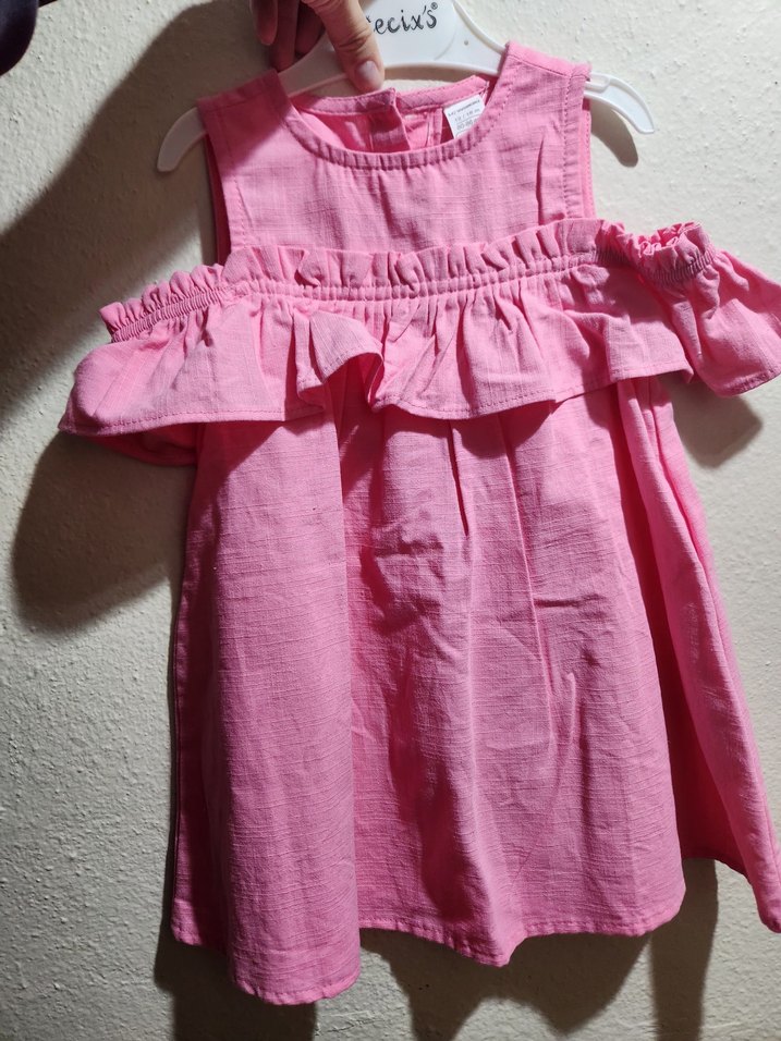 Kız çocukları için keten kumaştan, kol kısmı açık, fırfırlı detaylı, salaş kesim pembe elbise. Hiç kullanılmadı sıfır ürün