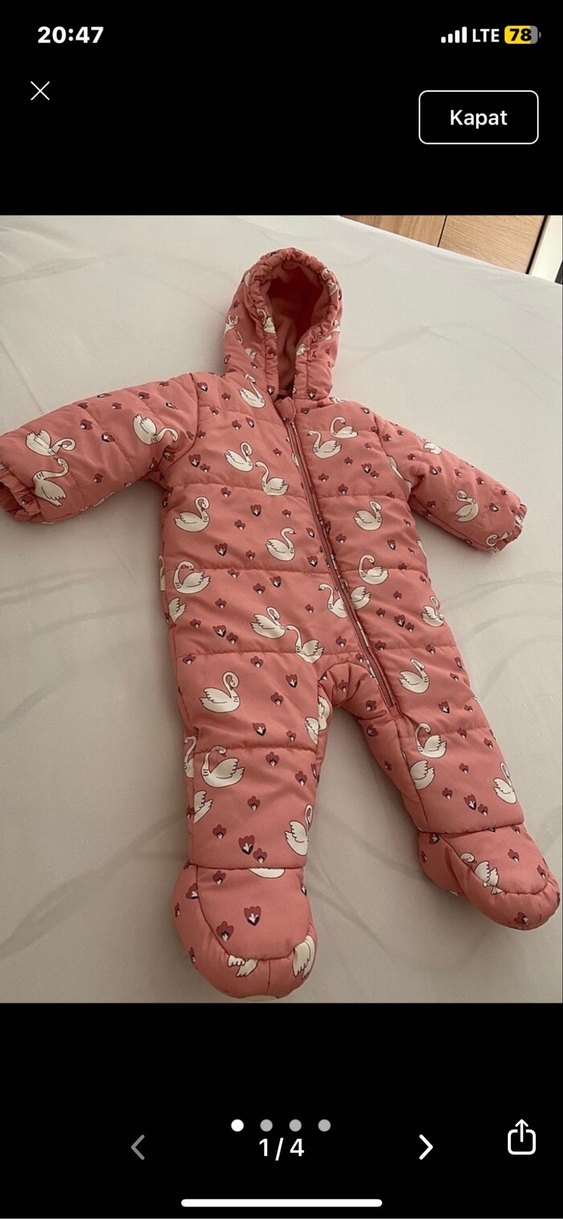 Pembe renkte, yüksek yakalı ve fermuarlı kız bebek tulumu, kuğu desenleriyle pastel tonlarda tasarlanmıştır.