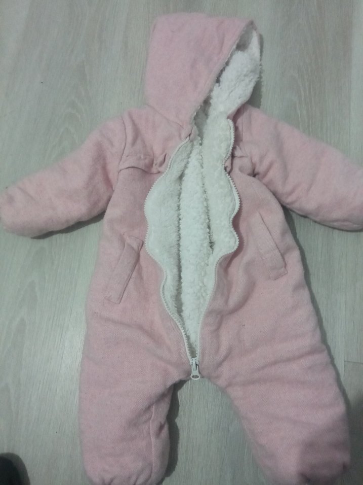 Pastel pembe renkte, kürk detaylı, yakası notched lapel olan kız bebek tulumu. Sade ve desensiz, önden fermuarlı, sıcak tutar. ❄️
