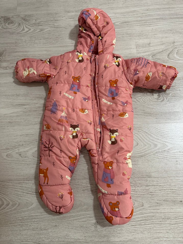 Pembe renkli, kürklü detaylı, desenli kız bebek tulumu. Kapüşonlu ve ayaklı, tam koruma sağlar.
