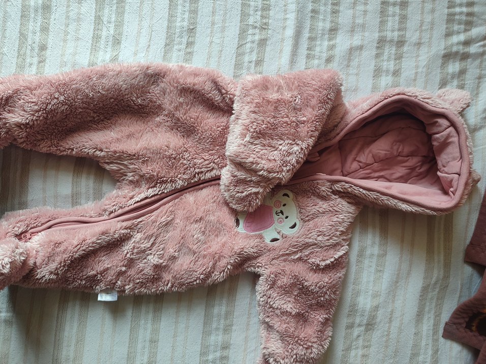 Pastel pembe renkte, kapüşonlu ve kürk detaylı kız bebek tulumu. Nakışlı desenleri ve yumuşak dokusuyla sıcak tutar. ❄️ patikli ve eldivenli boy 54cm