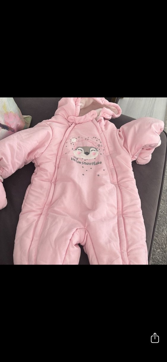Pastel pembe renkli, kürklü detaylı ve kar deseni baskılı kız bebek tulumu. Yuvarlak yaka ve yumuşak kumaştan üretilmiştir. ❄️