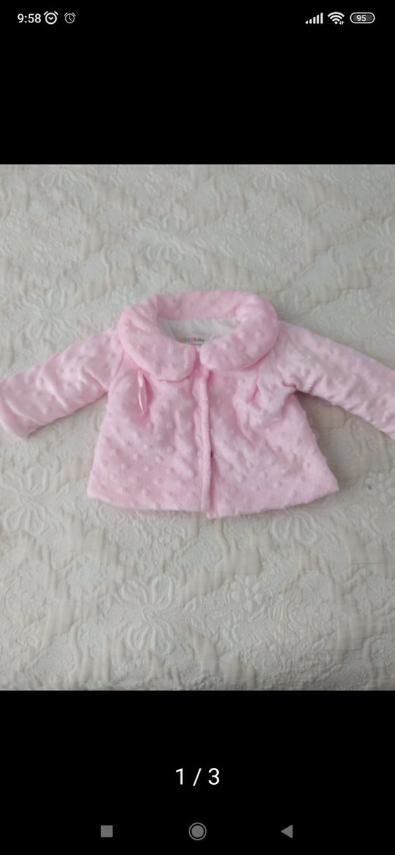 Yumuşak pembe kumaştan, kürk detaylı yakalı, düz ve pastel renkli kız bebek polar ceketi. Hafif dokulu ve dar kesim.