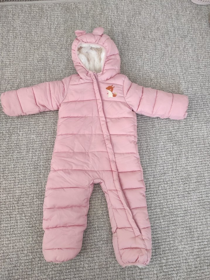 Pastel pembe, kürklü kapüşon ve kesimli yaka detaylı kız bebek tulumu. sıcak tutan dolgulu yapıya sahiptir.el ayak kısımları korumalı.