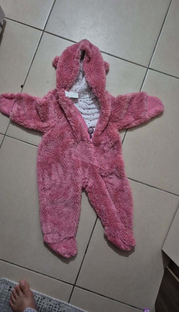 Kürklü detaylı, kapüşonlu ve ayaklı pembe bebek tulumu, bebeği sıcak tutar.