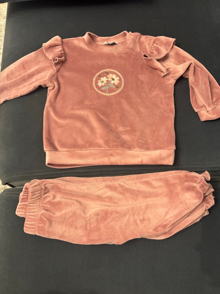 Koyu pembe renkli kız bebek takımında uzun kollu üst, fırfır detayları ve nakışlı çiçek deseni bulunur. Yumuşak ve rahat kumaş. Tertemiz 2 kez giyildi
