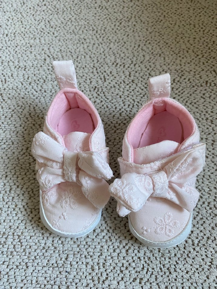 Nakışlı ve dantelli detaylara sahip pastel pembe kız bebek ilk adım ayakkabısı. Rahat ve dayanıklı kauçuk tabanlı.