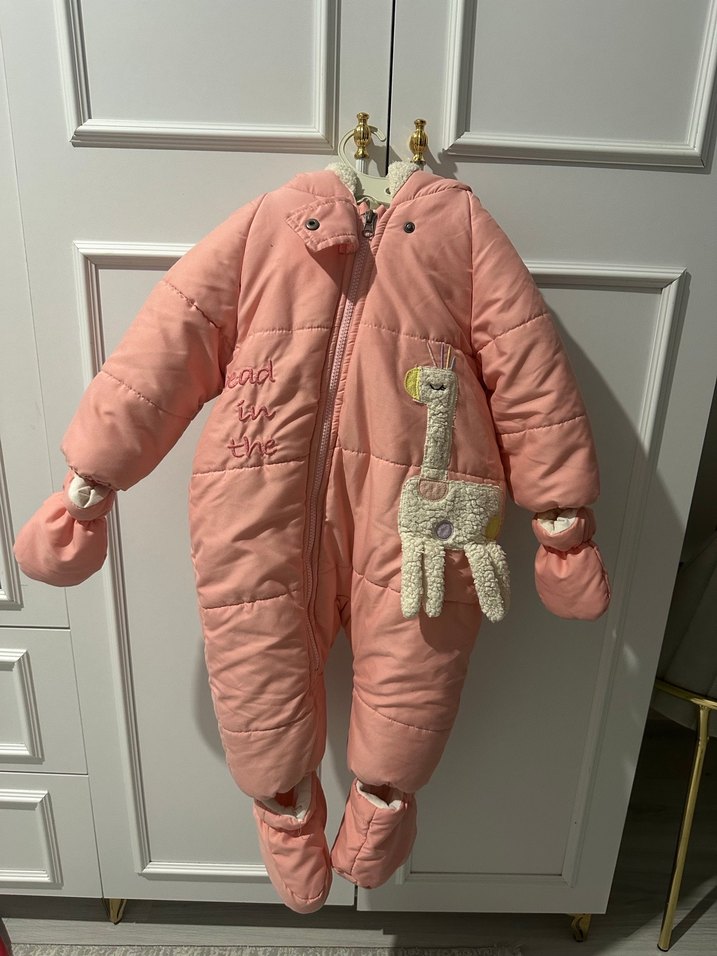 Pastel pembe, kürklü detaylı, nakış desenli ve yakası kesimli kız bebek tulumu. Soğuk havalar için sıcak ve rahat ❄️.