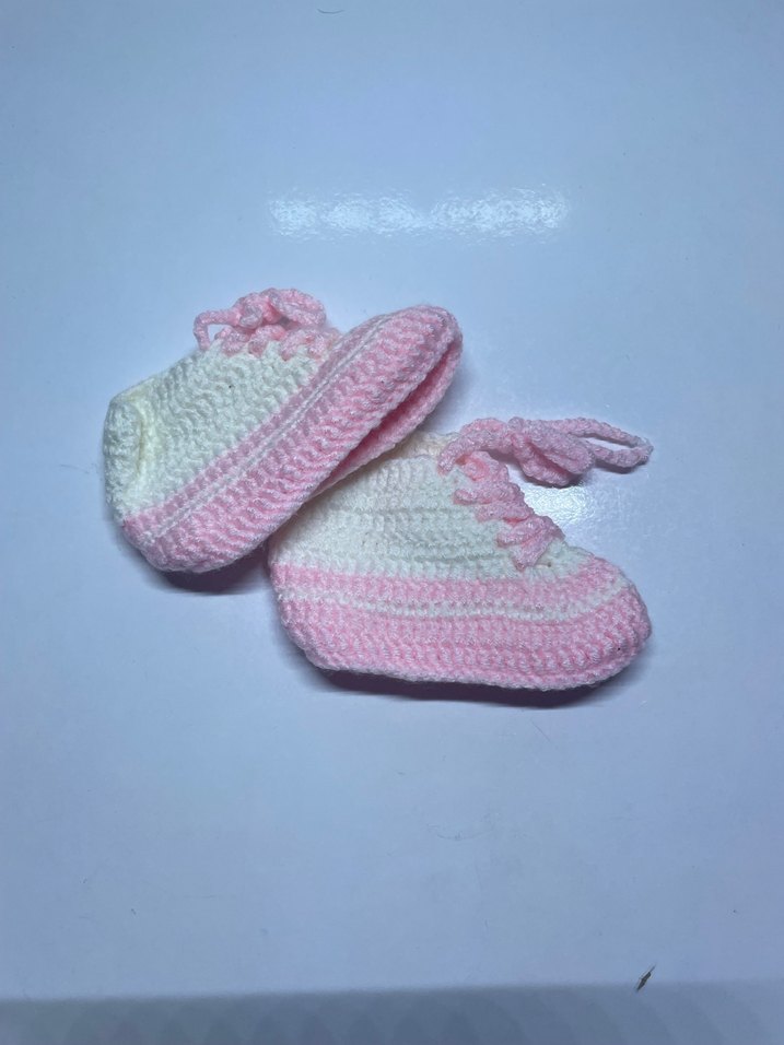 Pembe ve beyaz renklerde, yumuşak örgü ipten yapılmış kız bebek patikleri. 19 numara 12 cm (isteğe göre farklı renkte yapılabilir)